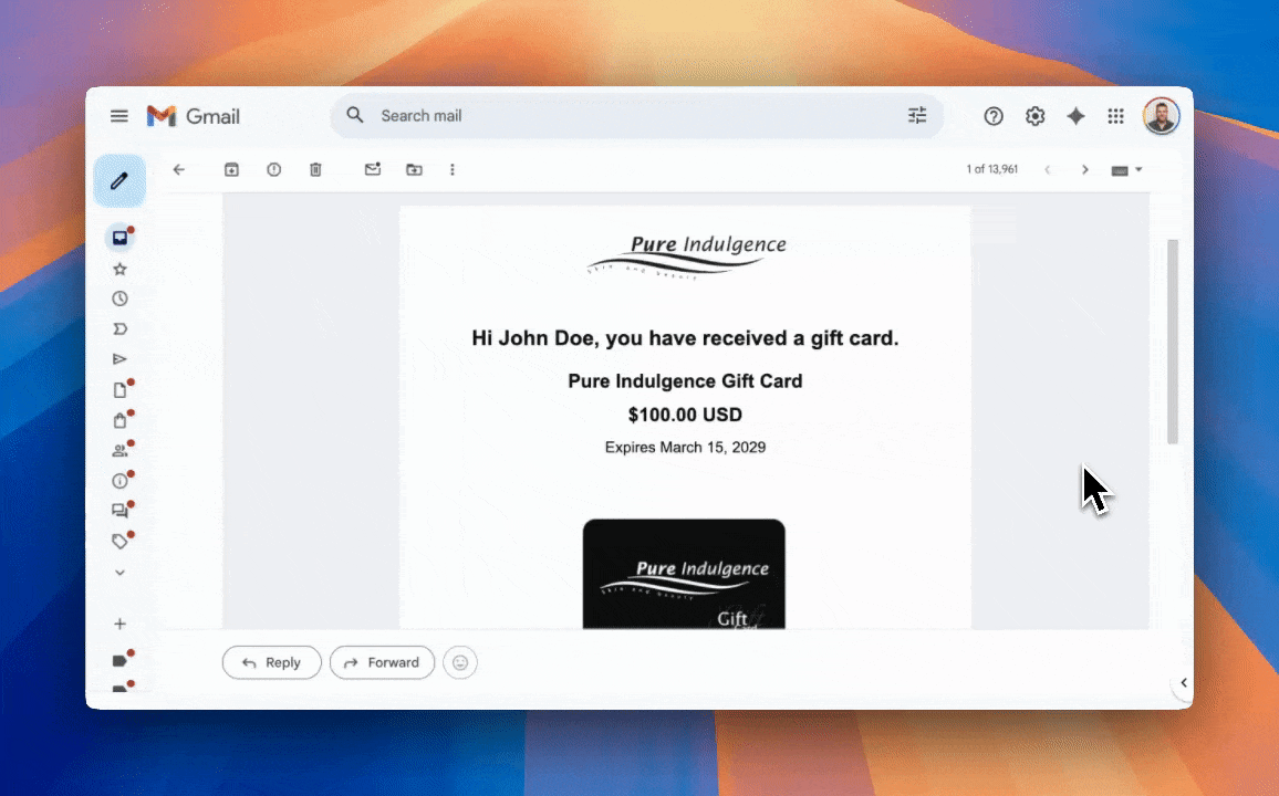 When the customer receives their gift card email from Shopify, they click a button to generate a printable version. The email passes the required data through query parameters, the PDF is generated instantly, and nothing is stored.